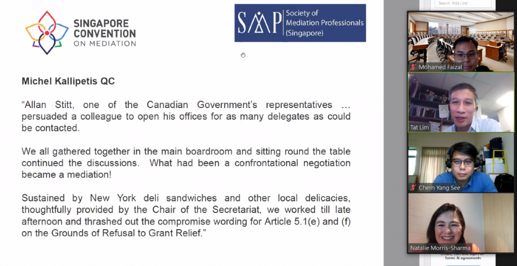 Mrs Morris-Sharma also shared some insights into how some of the challenges that came up during the course of negotiations were resolved, including how the “5-issue compromise” was eventually struck in February 2017 (as well as the practical challenges during the course of that negotiation in the main boardroom, including  her decision to buy lunch for everyone so that the amicable and flowing negotiations taking place at the time could continue uninterrupted by a lunch break!) and how consensus was eventually arrived at with that discussion at the core, through the hard work of all of those who were around the table. Mrs Morris-Sharma also shared some of her thinking about how COVID-19 may feature in the journey of the Singapore Convention.  Mrs Morris-Sharma also shared about how the existence of the Singapore Convention in the background (even in countries which have not ratified it) will likely serve to inform international norms of what mediation and mediated settlements are all about.